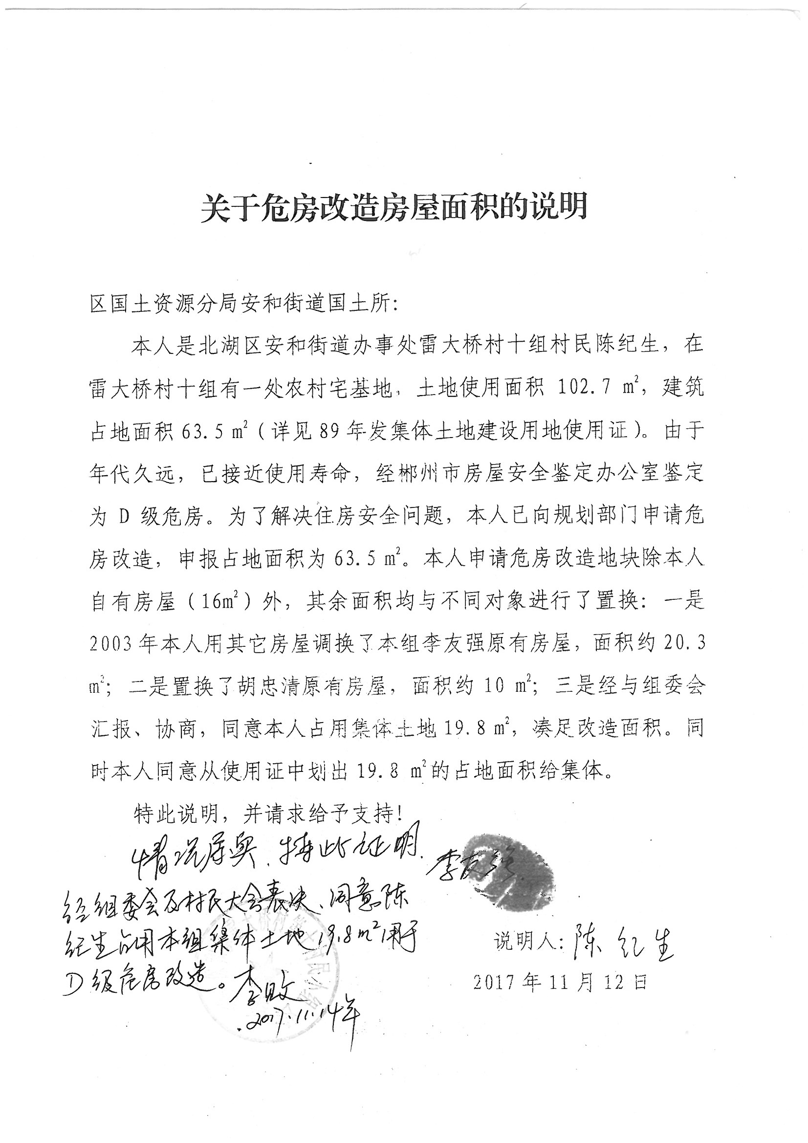 陈纪生(身份证:432801195010158018)系安和街道雷大桥村十组村民,由于现房屋年久失修等原因,经房产部门鉴定为D级危房。现经组、村、街道国土所、街道办事处初审合格,并向我局申请办理该户原址、原层数、原面积D级危房改造,拟占地面积63平方米,层数2层。现我局对该申请事项进行批前公示,以征求利害关系人的意见。