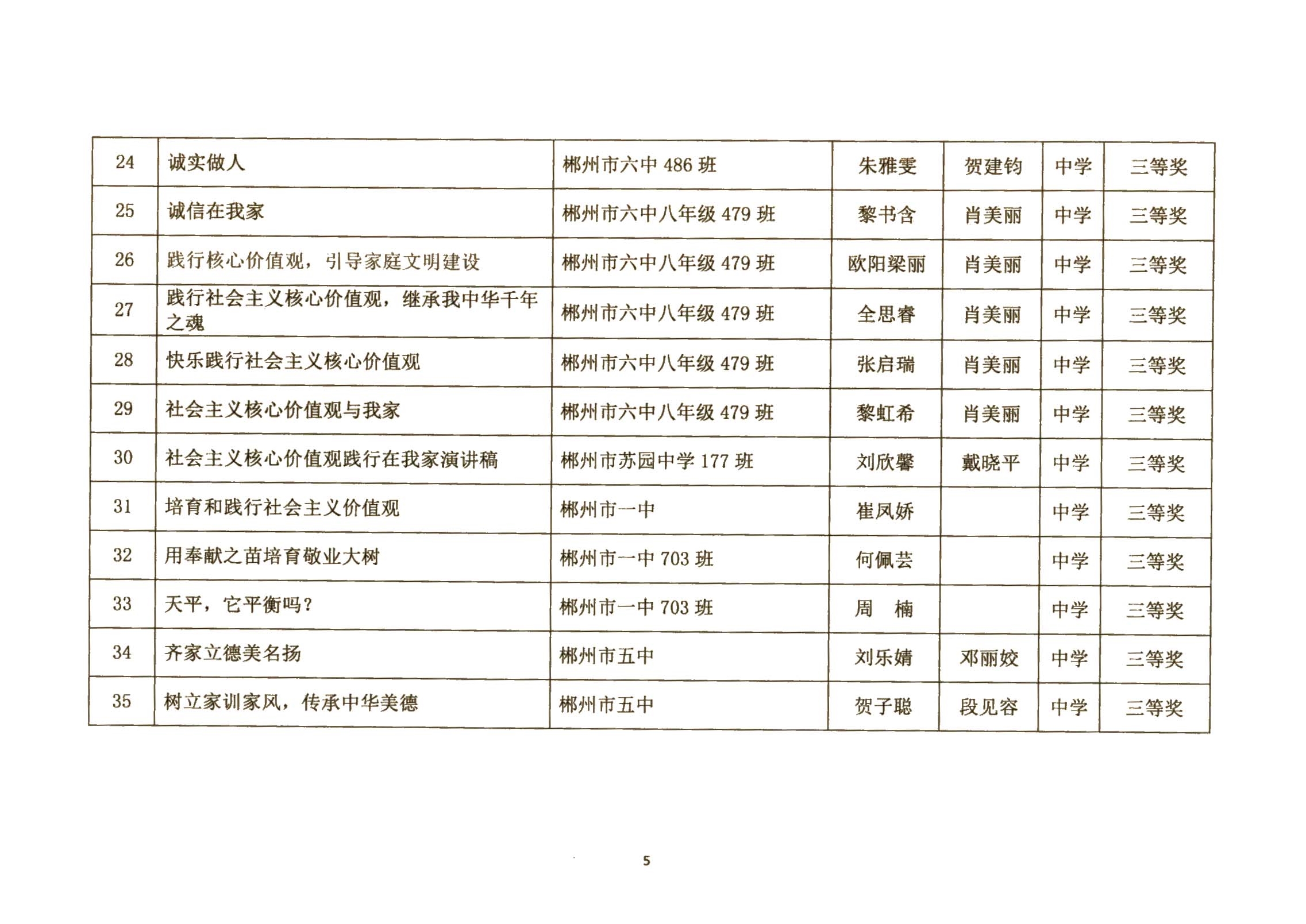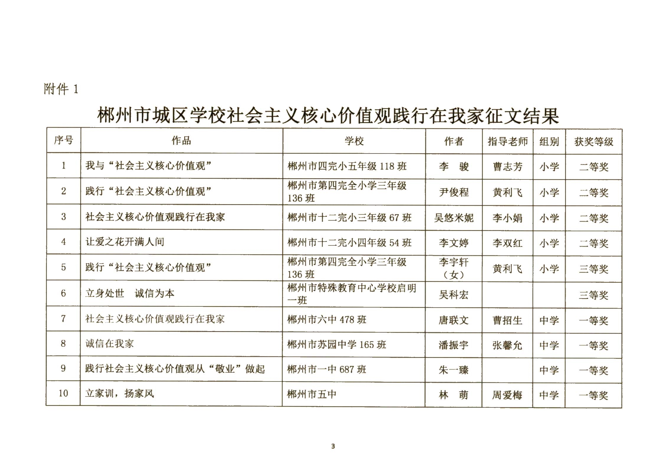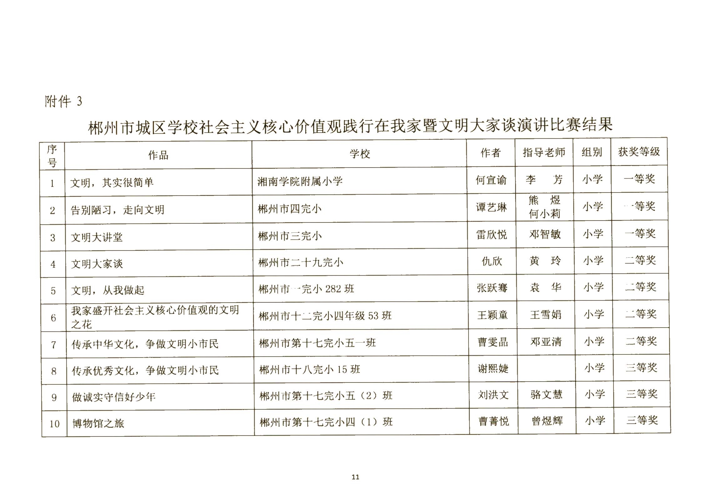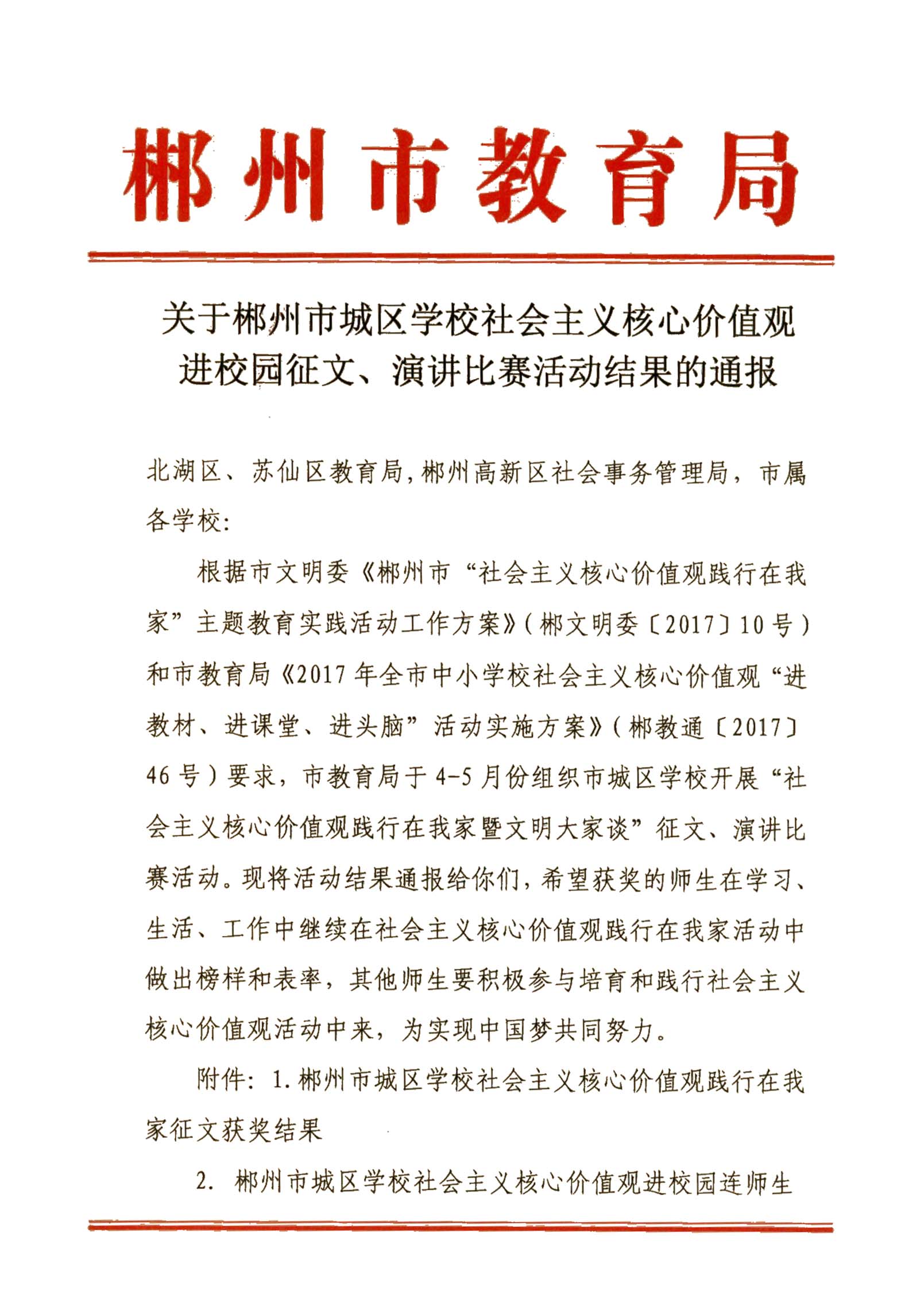 关于郴州市城区学校社会主义核心价值观进校园征文、演讲比赛活动结果的通报