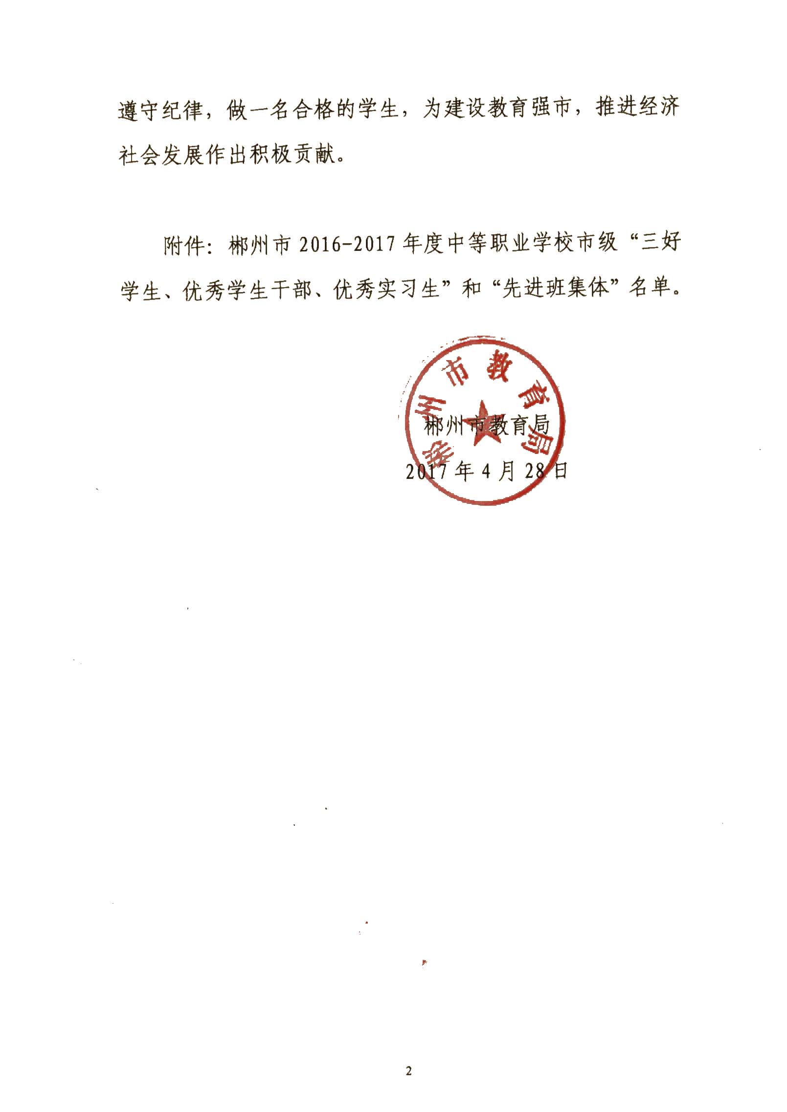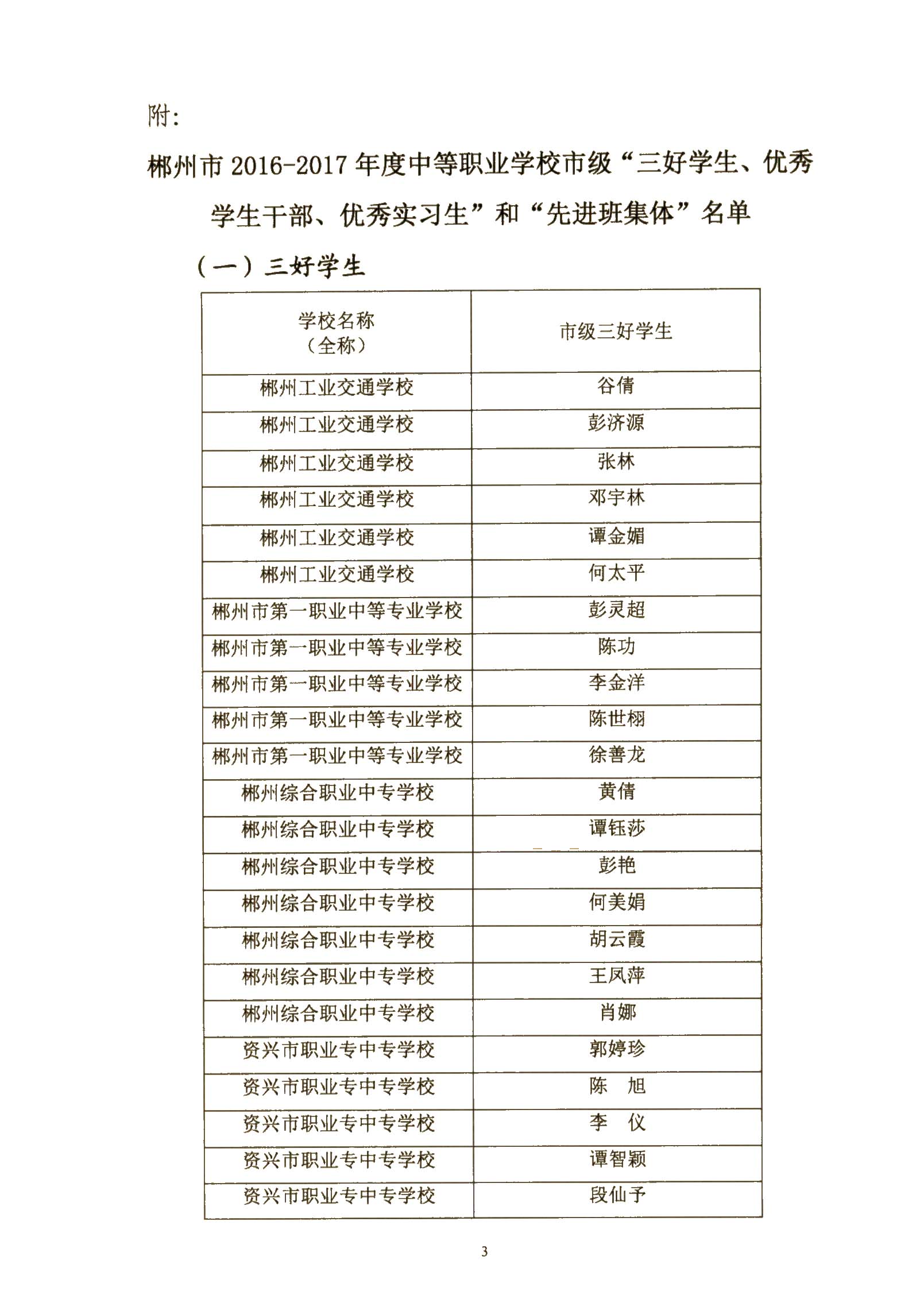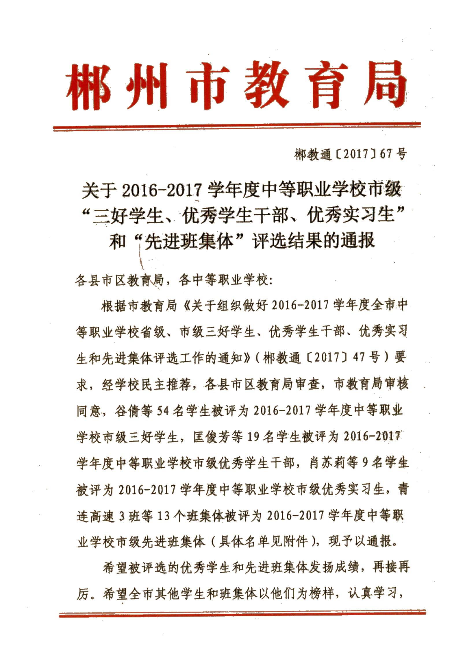 关于2016—2017学年度中等职业学校市级“三好学生、优秀学生干部、优秀实习生”和“先进班集体”评选结果的通报