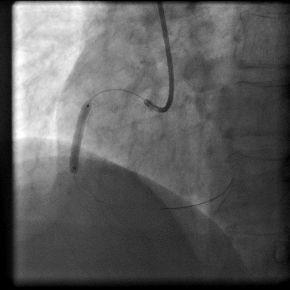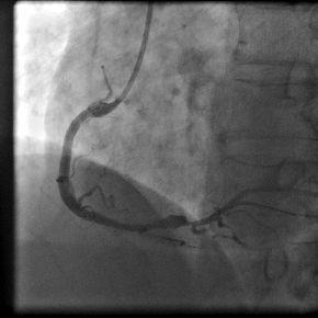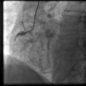 病例介绍:陈姓35岁青年男性,因“突发胸痛2小时”与凌晨1:00入我院急诊科,入院后即刻心电图提示急性下壁、后壁心肌梗死,认为应立即行急诊PCI术。立即给予足量阿斯匹林和波立维,启动急性心肌梗死救治绿色通道。导管室护士、技师、心内科医生在导管室等待,并且做好术前准备。在得到患者家属同意后,我们迅速带患者入导管室。急诊冠脉造影示:右冠状动脉近段完全闭塞,通过血栓抽吸,球囊扩张,开通闭塞血管,右冠近段成功植入药物涂层支架一枚,患者转危为安,整个过程用时28分钟。