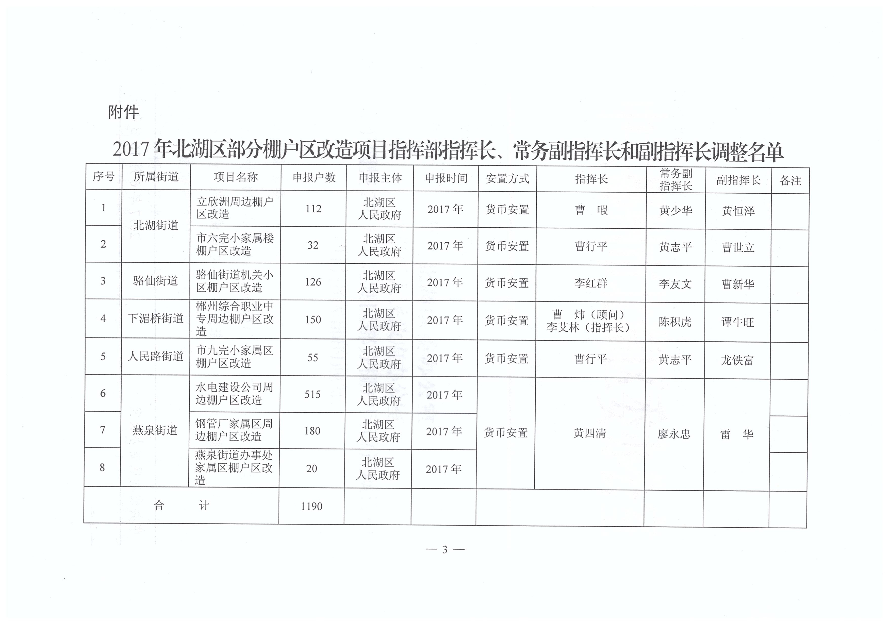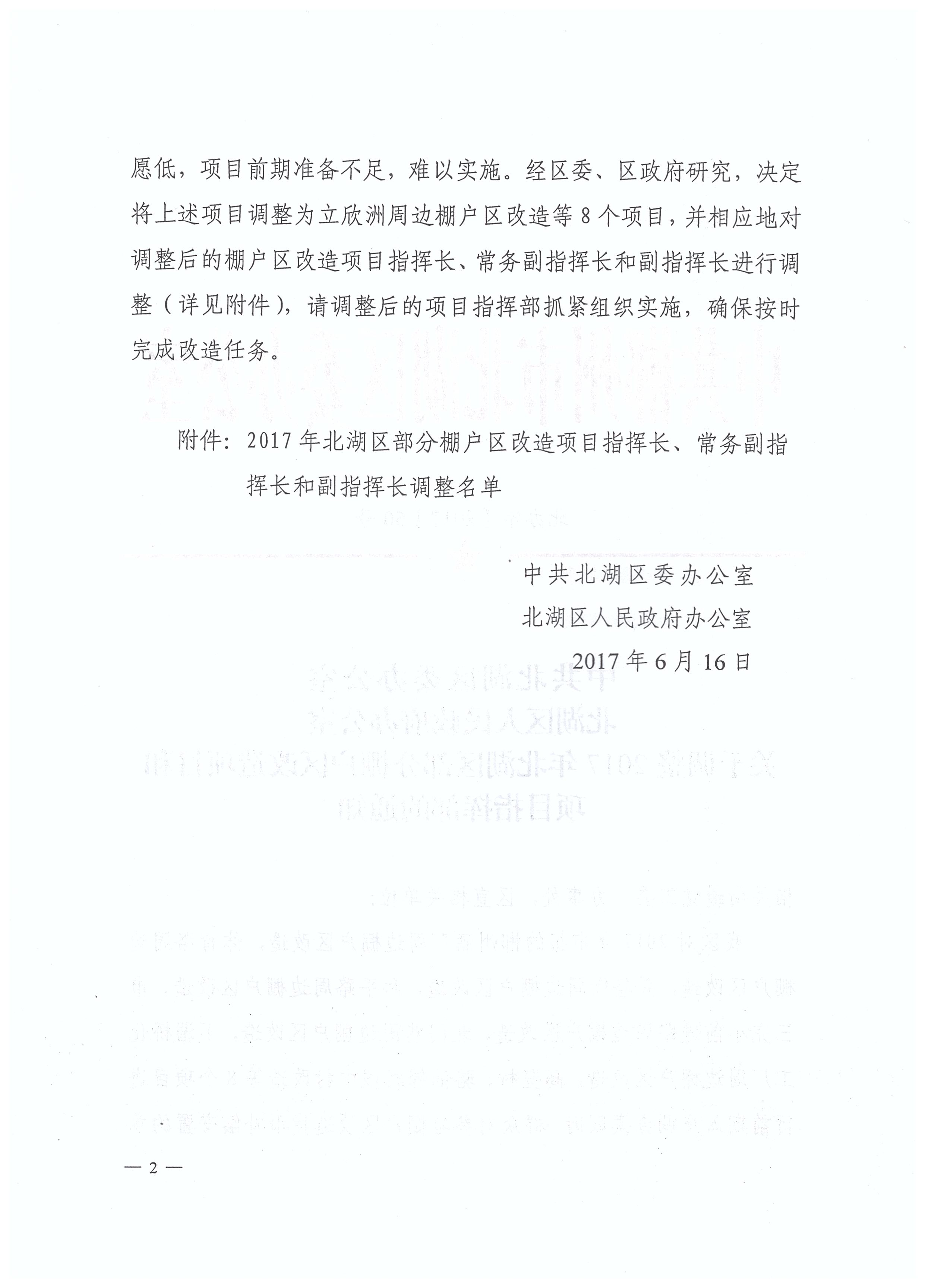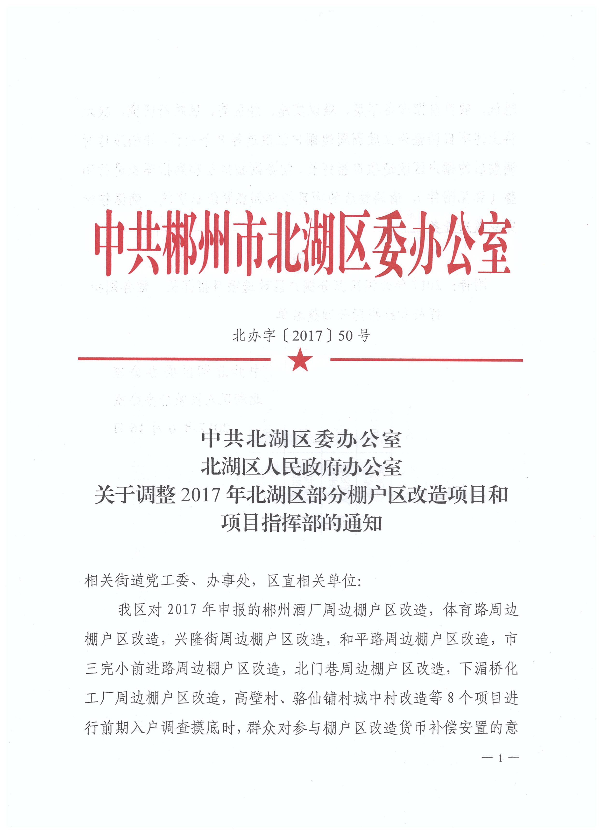北办字【2017】50号 关于调整2017年北湖区部分棚户区改造项目和项目指挥部的通知