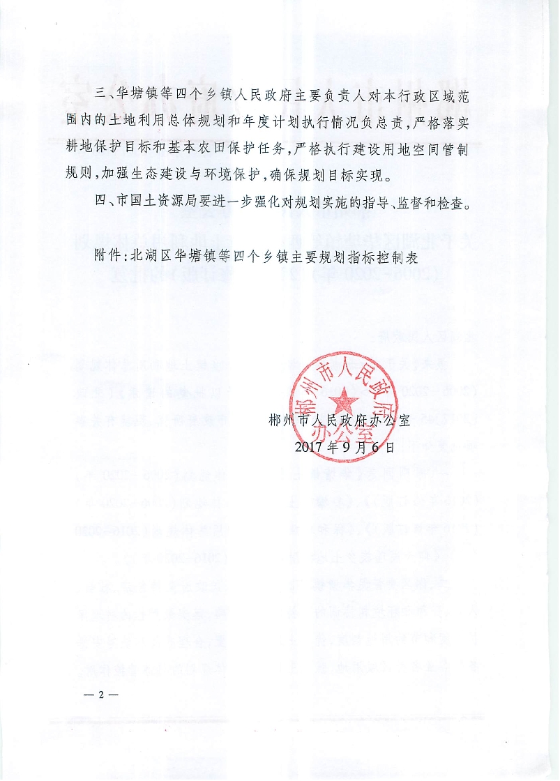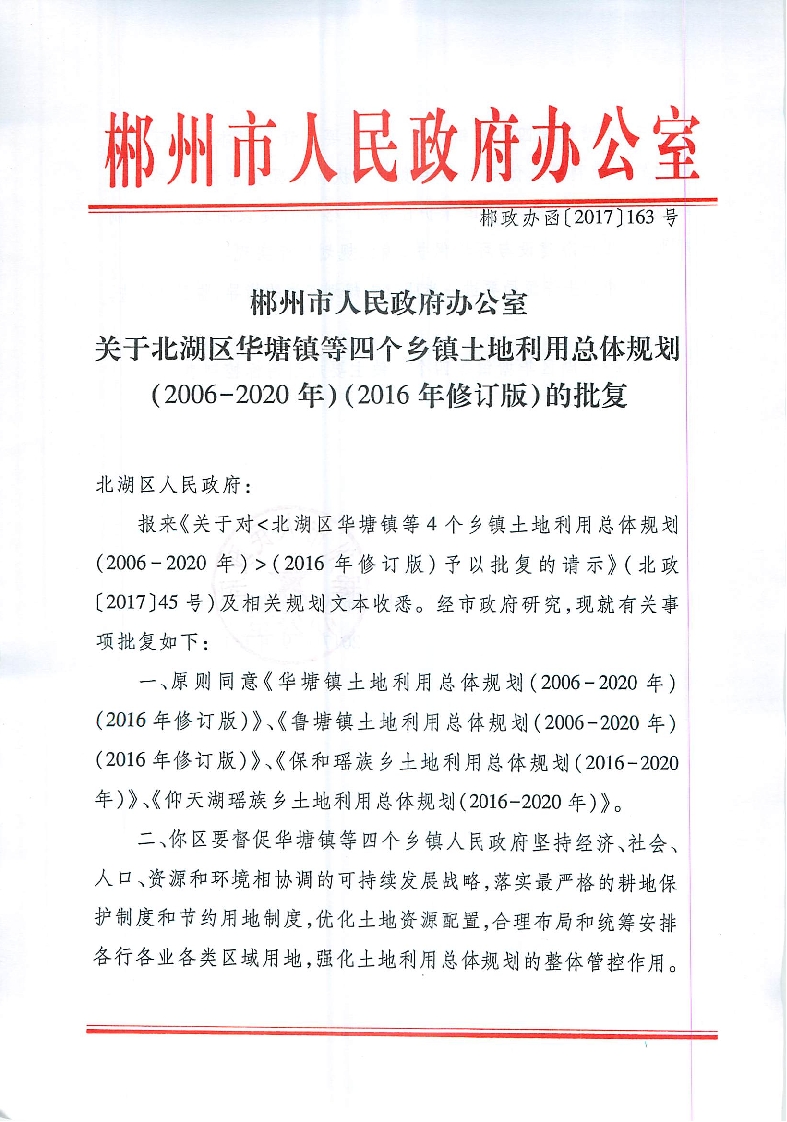 郴州市人民政府办公室关于北湖区华塘镇等四个乡镇土地利用总体规划(2006-2020)年(2016年修订版)的批复